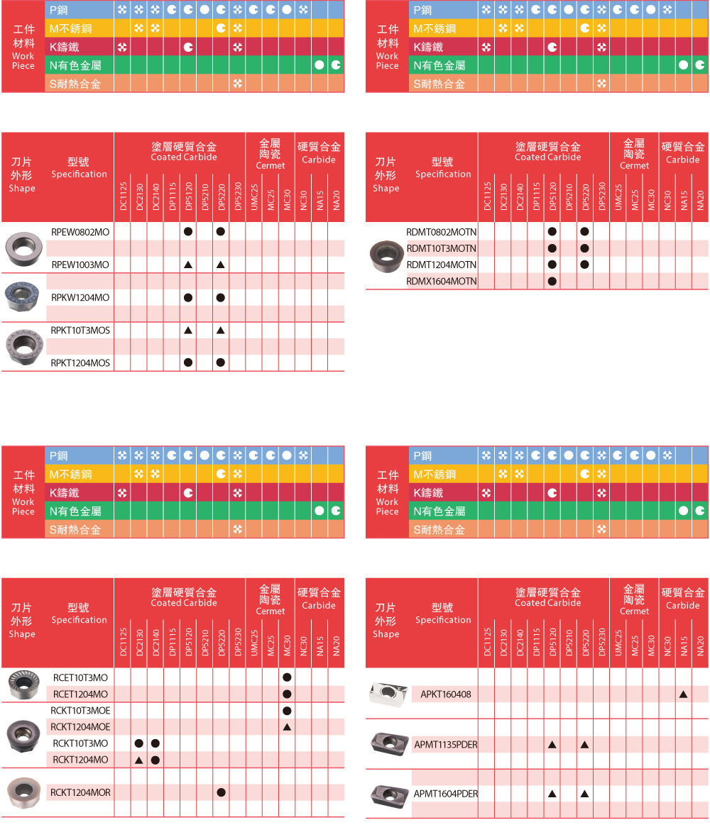 | Insert Grades - Milling 銑刀片牌號一覽表 |