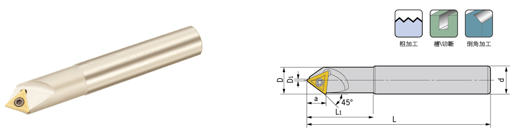 本銑刀可45度切削,亦可做倒角,V槽切削,可中心定位鑽使用。